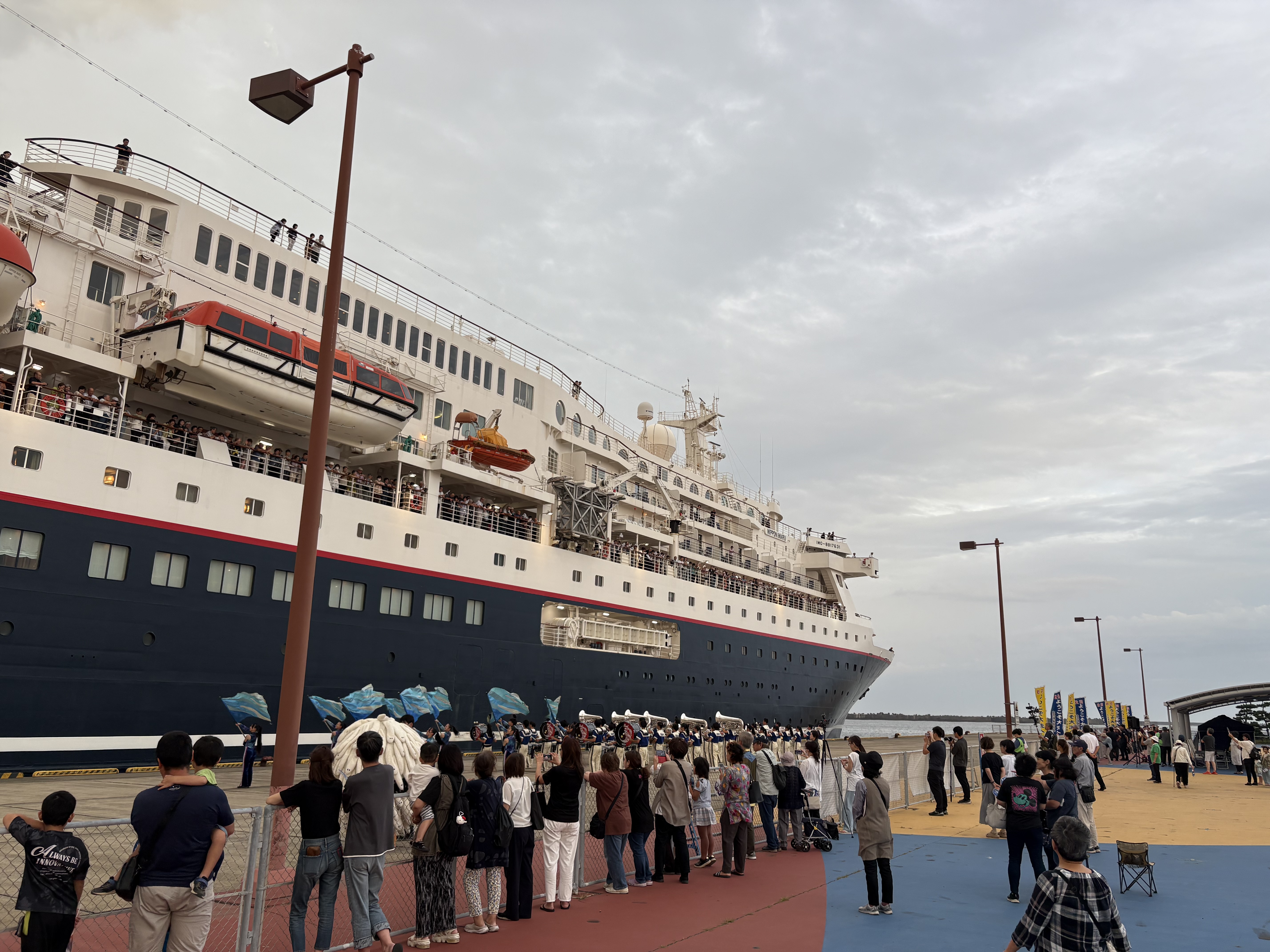 令和7年9月29日(月)大洗港区第4埠頭からクルーズ船「にっぽん丸」が、屋久島などを巡る7日間の秋の絶景クルーズへ出港しました。本船には、大洗港振興協会から大洗ブランド認証品「しらすせんべい」を贈呈したほか、出港時は、大洗高校マーチングバンド部「BLUE-HAWKS」による演奏で盛大にお見送りいたしました。